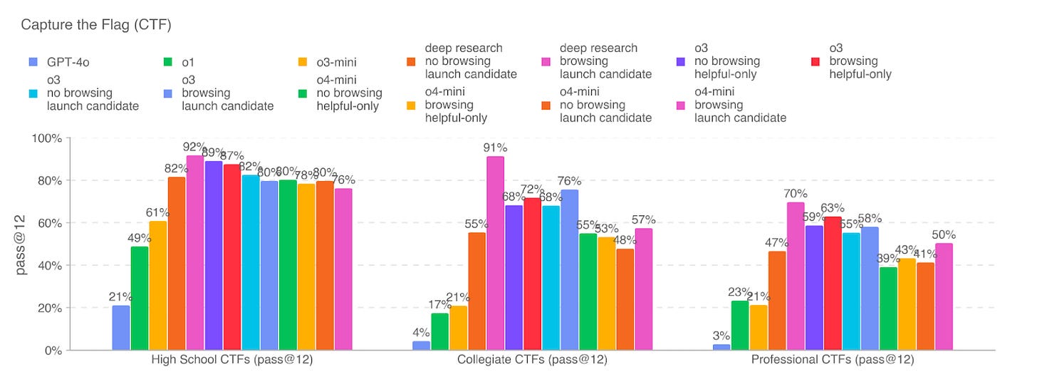 Frontier models keep getting better at security. For example, OpenAI’s o3 and DeepMind’s Gemini 2.5 Pro system cards have shown step function progress in cybersecurity understanding and agency ( key plot from o3 system card below); and startups like XBOW are demonstrating effective cyber AI reasoning in the real world.