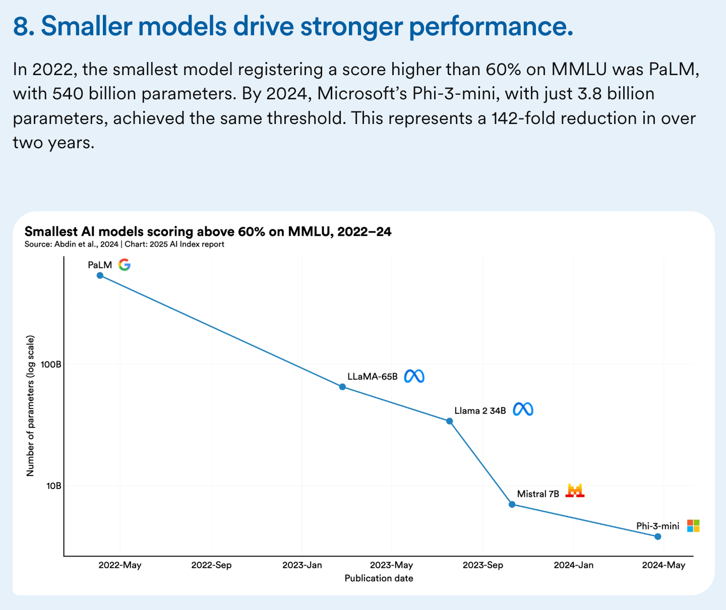 Here’s a chart showing models that get good MMLU general knowledge results shrinking over time: